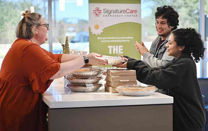 In the first photo below, Giselle Galvan and Julio Olavarria (right) received their free pies from SignatureCare Emergency Center, Texarkana marketing assistant Amanda Bowers, pictured on the left.